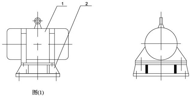 ZFB系列防閉塞裝置的結(jié)構(gòu)如圖1所示。由振動(dòng)電機(jī)(1)、底座(2)兩部分組成。振動(dòng)電機(jī)和底座由螺栓緊密地固定為一體。由于底座緊固地安裝在料倉(cāng)壁上,這樣就構(gòu)成了單質(zhì)點(diǎn)定向強(qiáng)迫振動(dòng)系統(tǒng)。